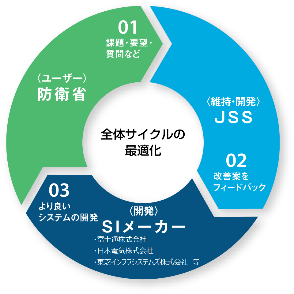 JSSからのフィードバックなどをもとに、防衛省の改善要望を反映した情報通信システムを開発。JSSとの連携により、防衛省における情報通信システムのさらなる発展、ひいては活動の円滑化に貢献。